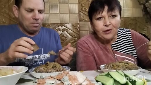 Мукбанг. Гречка с жареной печенью, квашеная капуста, сало слоёное, сок черешни. 😋👍