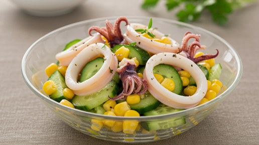 Как удивить гостей: салат с кальмарами, огурцами и кукурузой - просто, быстро и вкусно!