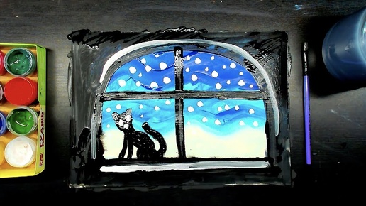 Как нарисовать ЗИМНЕЕ ОКНО и КОШКУ красками