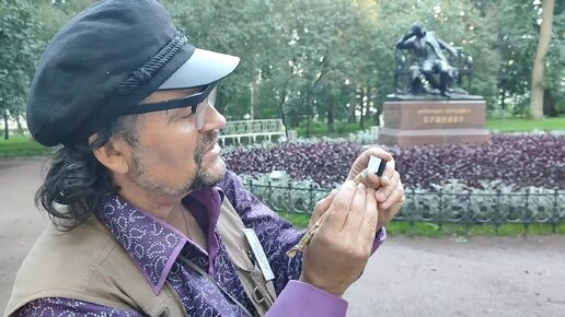 "У памятника Пушкину в Лицейском садике". Царь - Левша Андрей Рыкованов, художник, прямо на глазах делает миниатюру на рисовом зернышке.