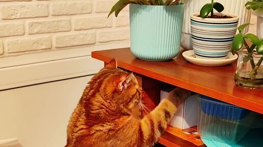 Персик 🍑 что-то ищет и пытается залезть на полку под столом. У него всё получится.