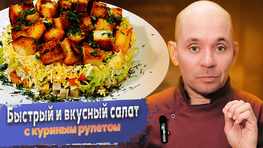 Быстрый и вкусный салат с куриным рулетом сухариками и сыром