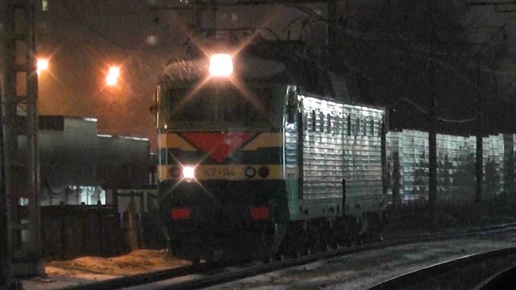 Поезда в снежный ноябрьский день близ платформы Новогиреево. Обзор рельсошлифовального поезда, сплотка ЧС7 и зелëная "Молния".