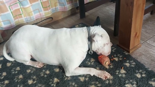 аппетитная еда Этуаль бультерьер кушает 🥕 морковь Кастропуло