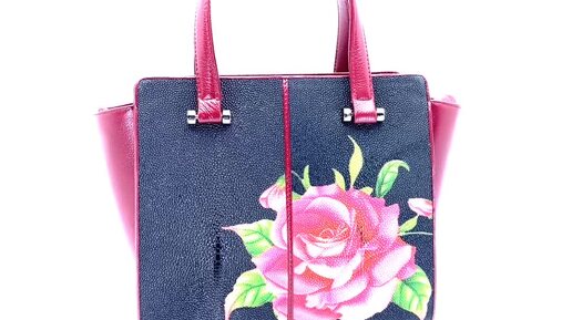 Сумка женская из кожи морского ската черного цвета с принтом розы 5075