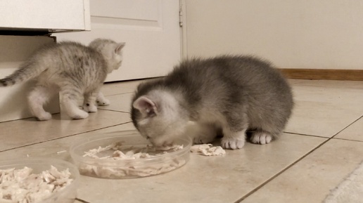 Котята кошки Кайли первый раз кушают варёную курочку.