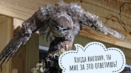 Замочили сову на ночь, теперь сохнуть будет. Сыч Лучик под тропическим дождиком