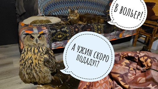 Сова филин Ёль осталась зимовать у кошки Морошки на весь день и ночь. Кошка Морошка очень рада!