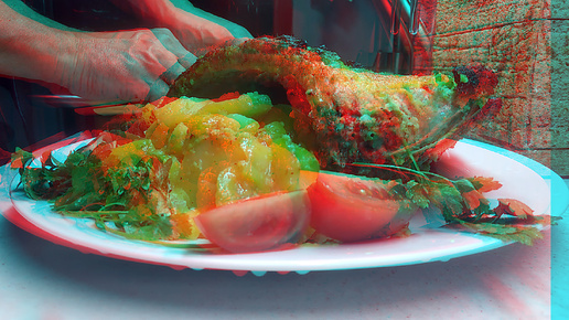 3D stereo red-cyan Рёбра свиные в гранатово-чесночном соусе с картофелем в рукаве