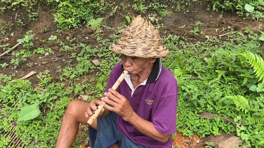 Индонезийский крестьянин играет на флейте в рисовых полях.