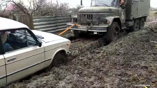 Мужик на ЗИЛ 131 спасает застрявшую ВАЗ 2106