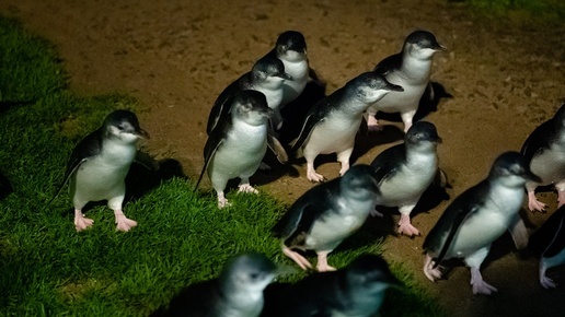 Пингвины спешат из океана на ночевку, штат Виктория, Австралия.