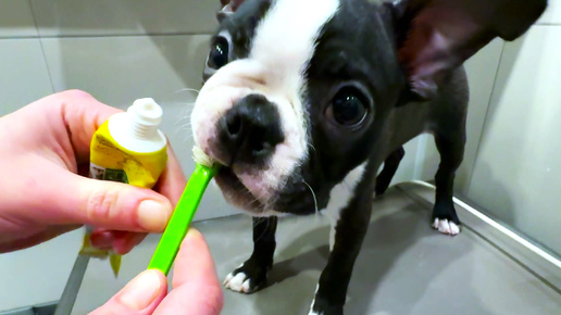Первое купание щенка Тайсона, уход за Бостон терьером, чистка зубов собаке смешные животные видео