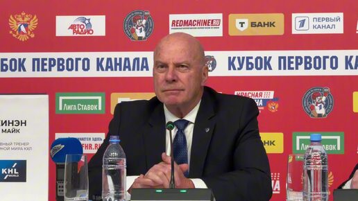 Наставник сборной мира КХЛ Майк Кинэн после уверенной победы нашей команды над сборной мира КХЛ на Кубке Первого канала