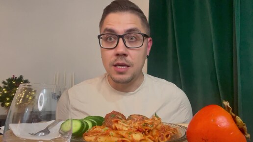 Мукбанг ❄️ Макароны, фрикадельки, огурец, хурма, сок | Подготовка к Новому году! 🎉