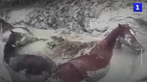 В Дагестане табун лошадей застрял в глиняной яме