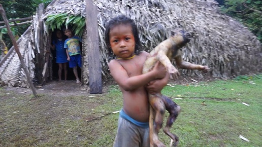 Полезная игрушка из джунглей.У Бысо в руках свежеобжаренная обезьяна.Сначала поиграет, а потом съест.Вот такое индейское детство.