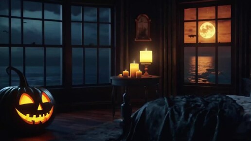 Дизайн спальни: спальня в стиле готических снов на Хэллоуин с видом на океан, освещенный луной.