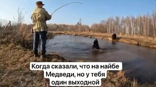 Ничего необычного, просто мужик из деревни играет с тремя медведями во время рыбалки.Типичная рыбалка в России.