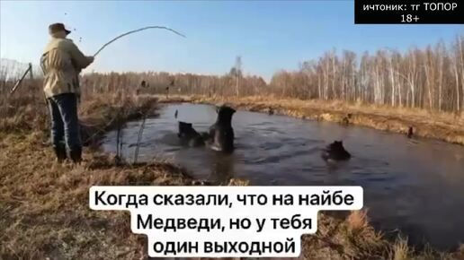 Ничего необычного, простой мужик из деревни играет с тремя медведями во время рыбалки.