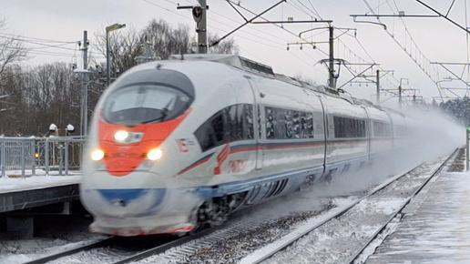 Высокоскоростной поезд ЭВС1 "Сапсан" сообщением Москва – Санкт-Петербург пролетает платформу Берёзки Дачные