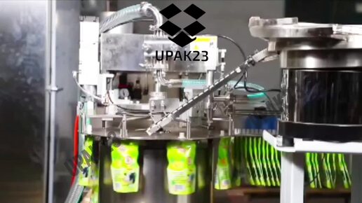 Автомат фасовки и укупорки густых веществ в пакет типа "дой-пак" с штуцером (на видео с полуавтоматической подачей крышек)