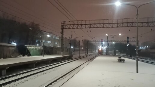 Электропоезд ЭД4М-0300 прибывает на пл. Варшавская параллельно с электровозом ЧС7-099 с поездом Ташкент - Москва