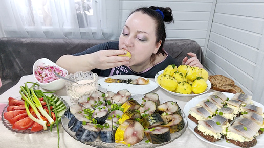 МУКБАНГ Скумбрия холодного копчения и пряного посола, картошечка, бутерброды с селедкой и маринованный лучок!