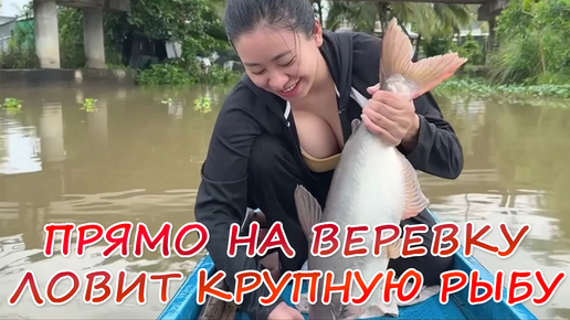 Прямо на веревку вьетнамская девушка ловит крупную рыбу