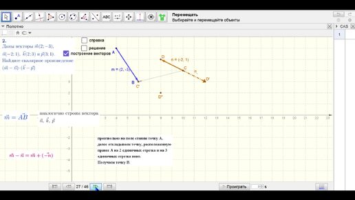 Тренировочный вариант 269, задача 2. Даны векторы m{2;-3}, n{-2;1}, k{2;3}, p{3;1}. Найдите скалярное произведение (m-n)*(k-p).