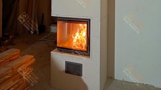 Российская угловая топка Астов П2С 700 на дровах, с боковым открыванием дверцы, встроенная в короб
