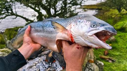 ЦЕЛЫЙ ЛОСОСЬ, копченый на огне на открытом воздухе _ АСМР-готовка на природе