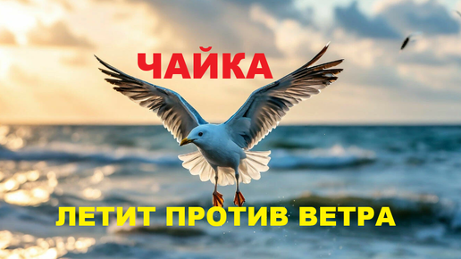 Чайка летит над морем, борясь с сильным ветром. Ейск. Ейская коса