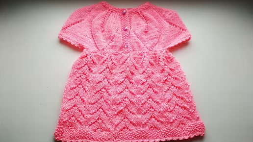 Платье спицами с круглой кокеткой с листьями на девочку от 0-7лет.