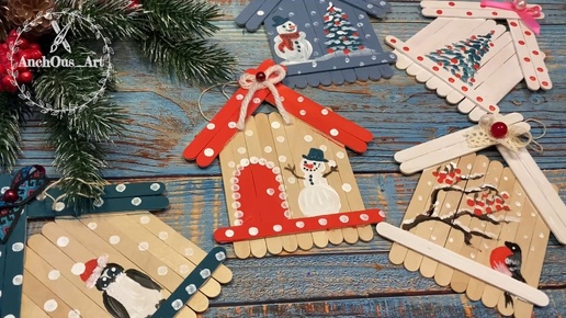 Новогодняя поделка для детей. Домики из палочек от мороженого