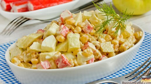 Нежный вкус с хрустящим дополнением. Крабовый салат с яблоком и сухариками