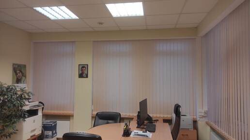 Вертикальные жалюзи персикового цвета для защиты от солнца и создания теплой рабочей атмосферы в офисном помещении.