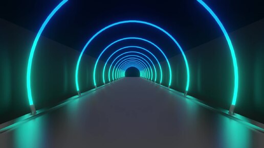 Неоновый спектральный туннель из зелено-голубых круглых арок на темном фоне. Цикличное видео. Футаж
