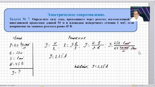 Физика08 ОК 004 Задача 7 Сопротивление проводника. Определите силу тока, проходящего через реостат, изготовленный из никелиновой проволоки..