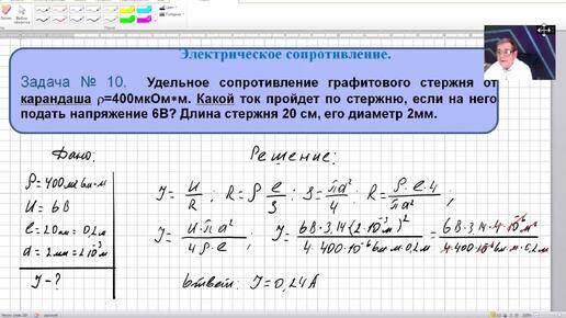 Физика08 ОК 004 Задача 10 Сопротивление проводника. Удельное сопротивление графитового стержня от карандаша r=400мкОм*м. Какой ток пройдет..