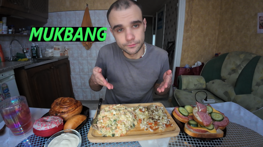 МУКБАНГ ОЛИВЬЕ / САЛАТ ИЗ КАПУСТЫ / БУТЕРБРОДЫ / БУЛОЧКА / ПОНЧИК / ОБЖОР EATING MUKBANG ASMR АСМР