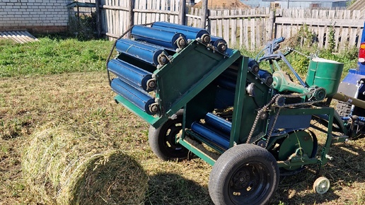 Самодельный минитрактор и прессподборщик в работе пресую сено