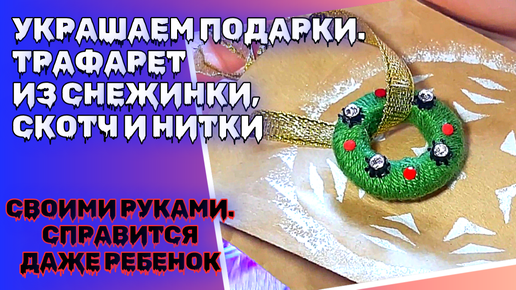Украшаем подарки своими руками. Все что понадобится: трафарет из снежинки, скотч и нитки
