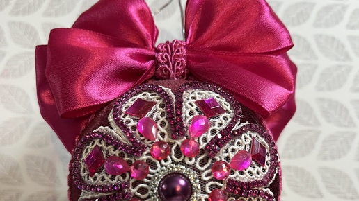 Создание новогодних украшений. Декор елочного шара в бархате кружевом, стразами.