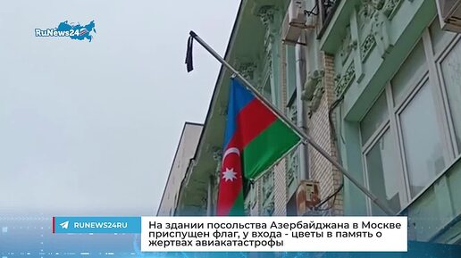 На здании посольства Азербайджана в Москве приспущен флаг, у входа - цветы в память о жертвах авиакатастрофы