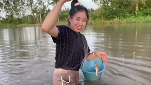 Вьетнамка с маленьким ведерком ищет рыбу и крабов КАК грибы