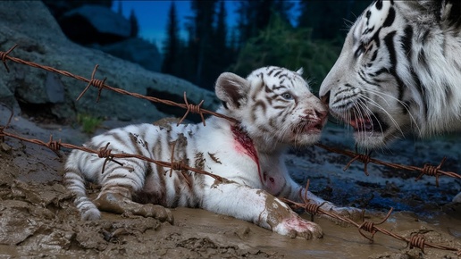 Мать-белая Тигрица умоляет Охотника спасти ее тяжело раненного детеныша, застрявшего в заборе из колючей проволоки.