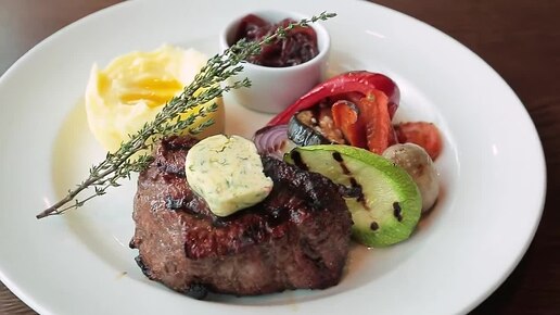 Стейк из вырезки говядины Шатобриант на гриле блюда гриль с гарниром ogonekcafe.ru