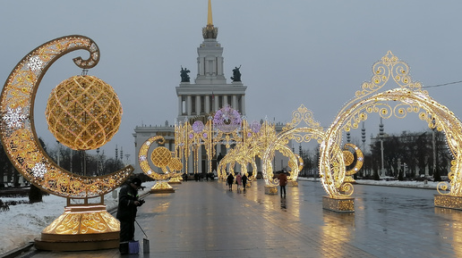Новогоднее оформление площади перед первым павильоном и возле главного входа на ВДНХ в рамках фестиваля "Зима в Москве".