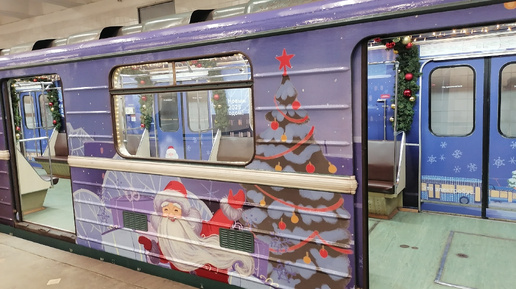 Новогодний вагон на Замоскворецкой ветке метро (станция Речной вокзал) в Москве.